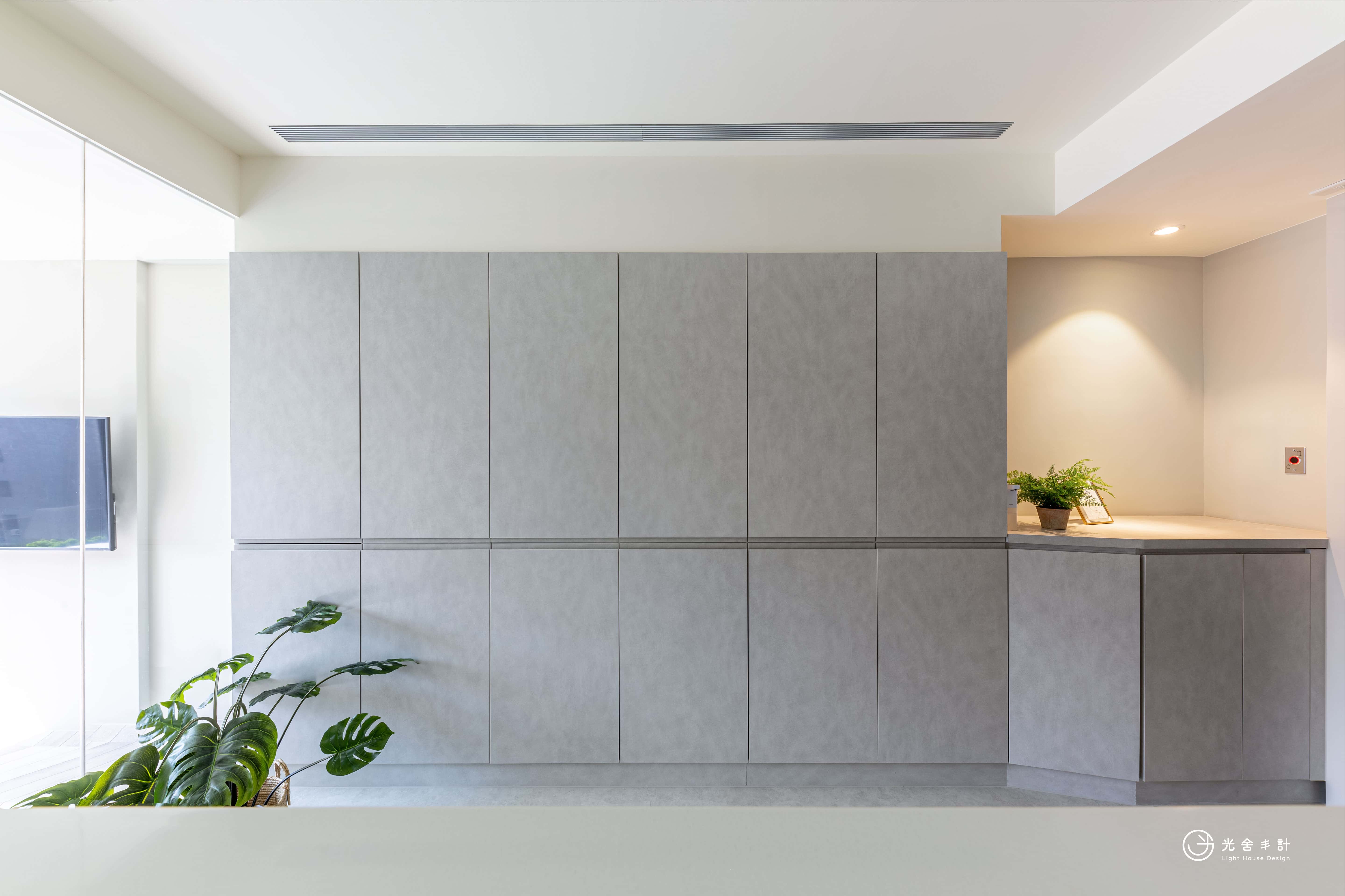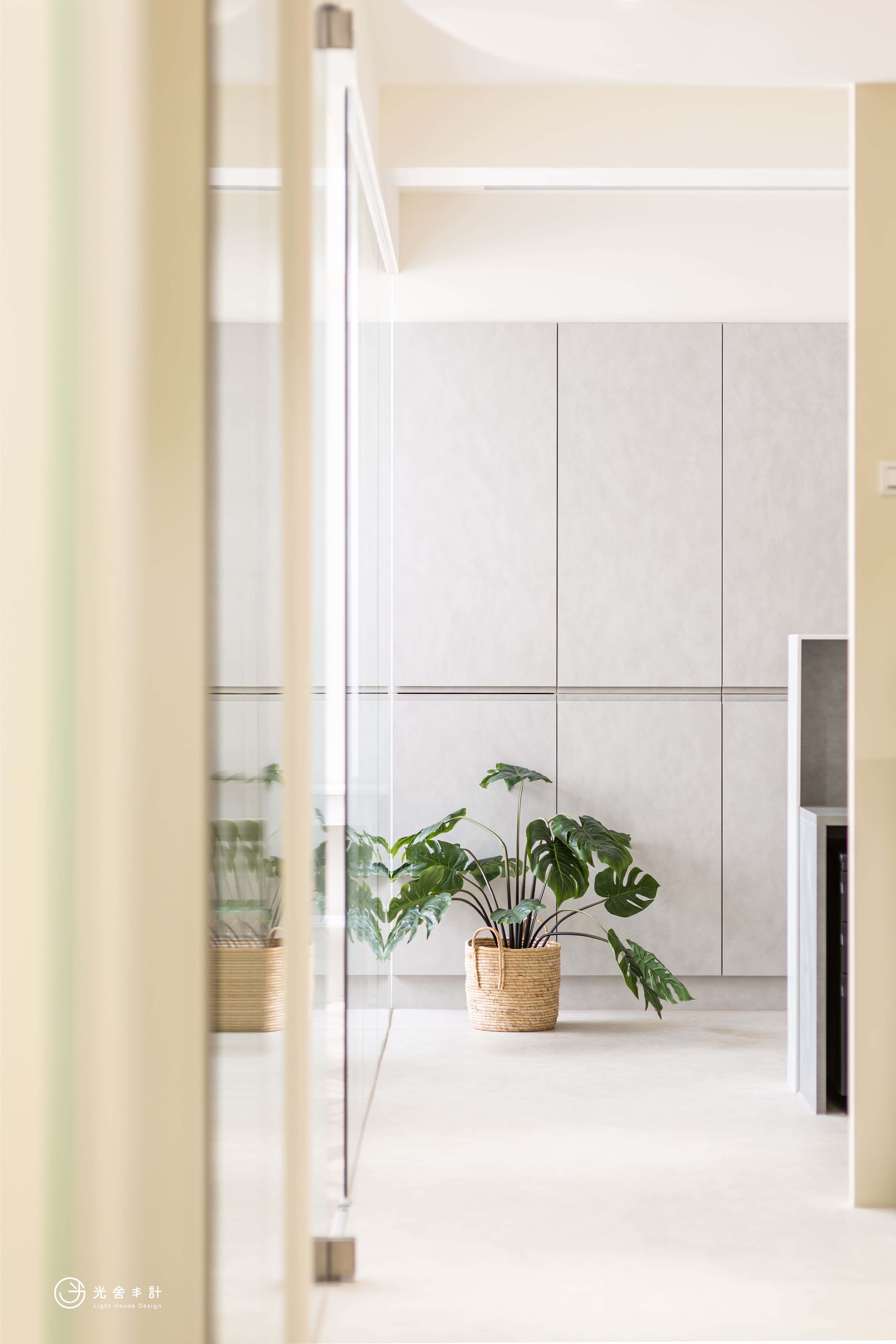 放大空間感,顏色讓空間在視覺上更大了,再用不同地材悄悄的分割出內外。
