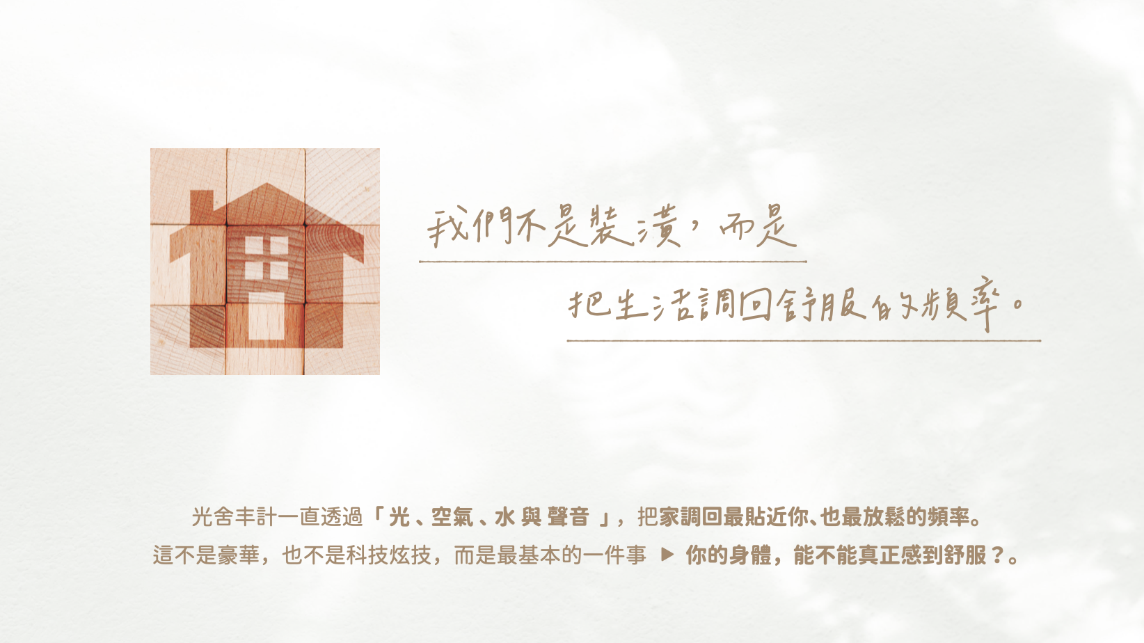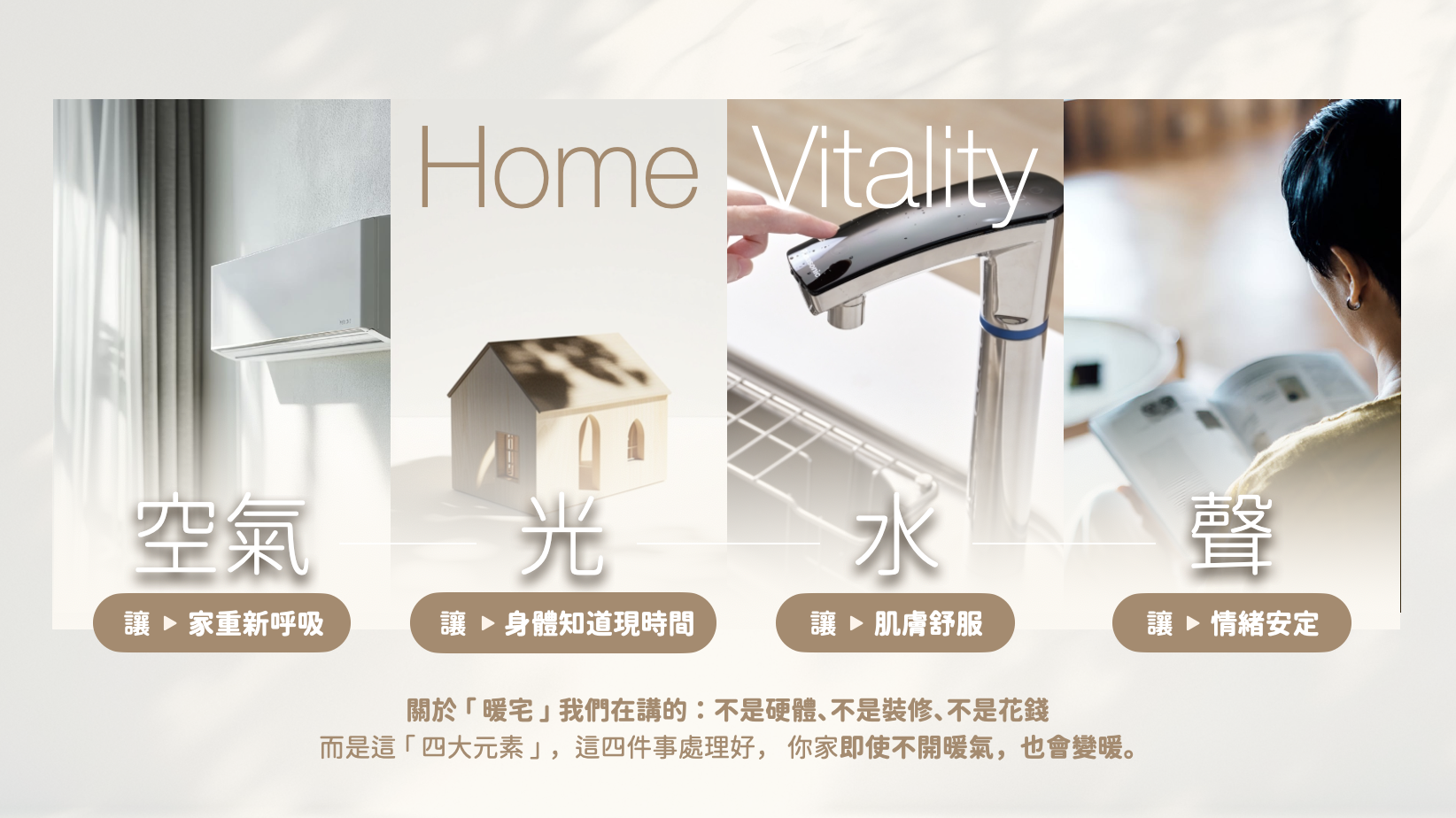 我們透過設計整合「光線、空氣、濕度與聲音」四大關鍵,不只解決冷與濕,而是讓生活變得順暢、體感變得舒服、情緒也跟著好起來。這四項元素,是每個家真正的健康指標。