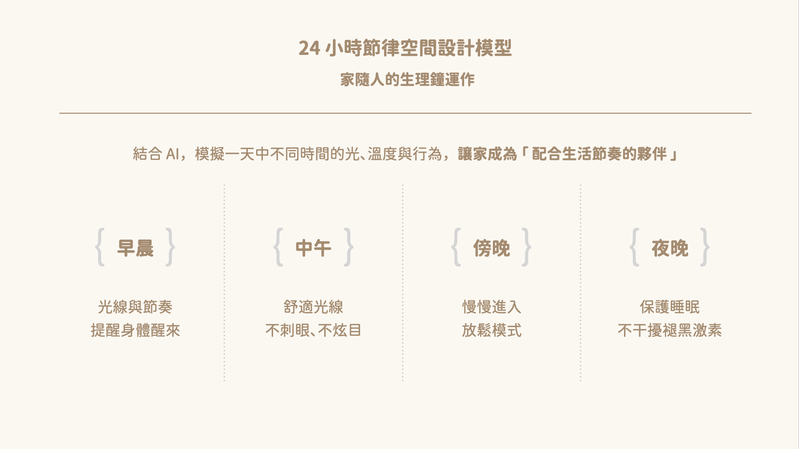 早晨的自然清爽光線讓人清醒、白天讓人專注、夜晚柔和光線則讓身體進入放鬆模式。