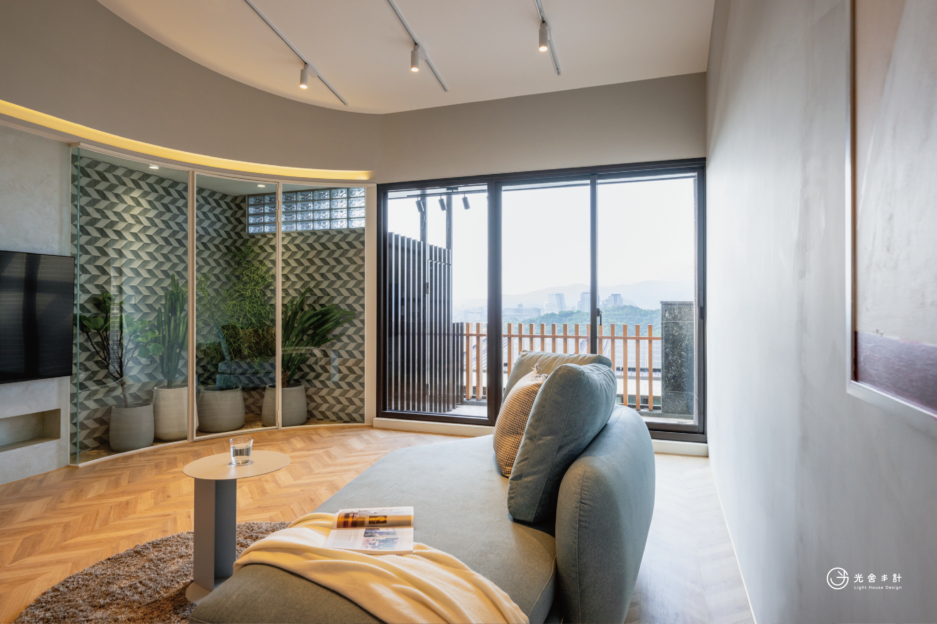 室內陽台,圓弧形的玻璃鐵件,有完美的盆景點綴,