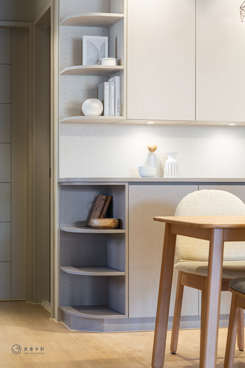 回到生活本質 讓陽光灑滿家,種下溫暖的種子。 設計要更貼近每一天的生活 屋主是一對年輕夫妻及一個超級可愛的小孩,也因為忙錄,在討論設計過程都放在如何工作忙錄之餘,讓房子在生活過幾年之後還是一樣可以輕鬆整理,看起來很舒適。 一進門就順手收納 鑰匙、外套、包包是回到家最需要被隨手收納的東西,一入門矮櫃跟旁邊的高櫃,在安排上就給它們一個家,家裡會顯得很整齊。 給小孩一個畫畫的牆面 孩子愛畫畫,在書房區放了一大堆烤玻,讓孩子習慣在那盡情畫畫,自就不會畫到其他牆面去了。 必備 茶水櫃(上下櫃): 早餐、茶包、營養品、藥品、水、必需雜物⋯這些每天都會使用,需要隨手可以拿得到。在規劃上,避開第一視角,朋友來就算來不及收才不會亂; 並且規劃上下櫃,不但視覺上看起來會乾淨很多,要拿的時候也很方便。 格局狹長調整 是長型的房子,著手天花板的設計去調校空間感。依使用功能分出空間,使用上更舒適,光線灑下更自然。